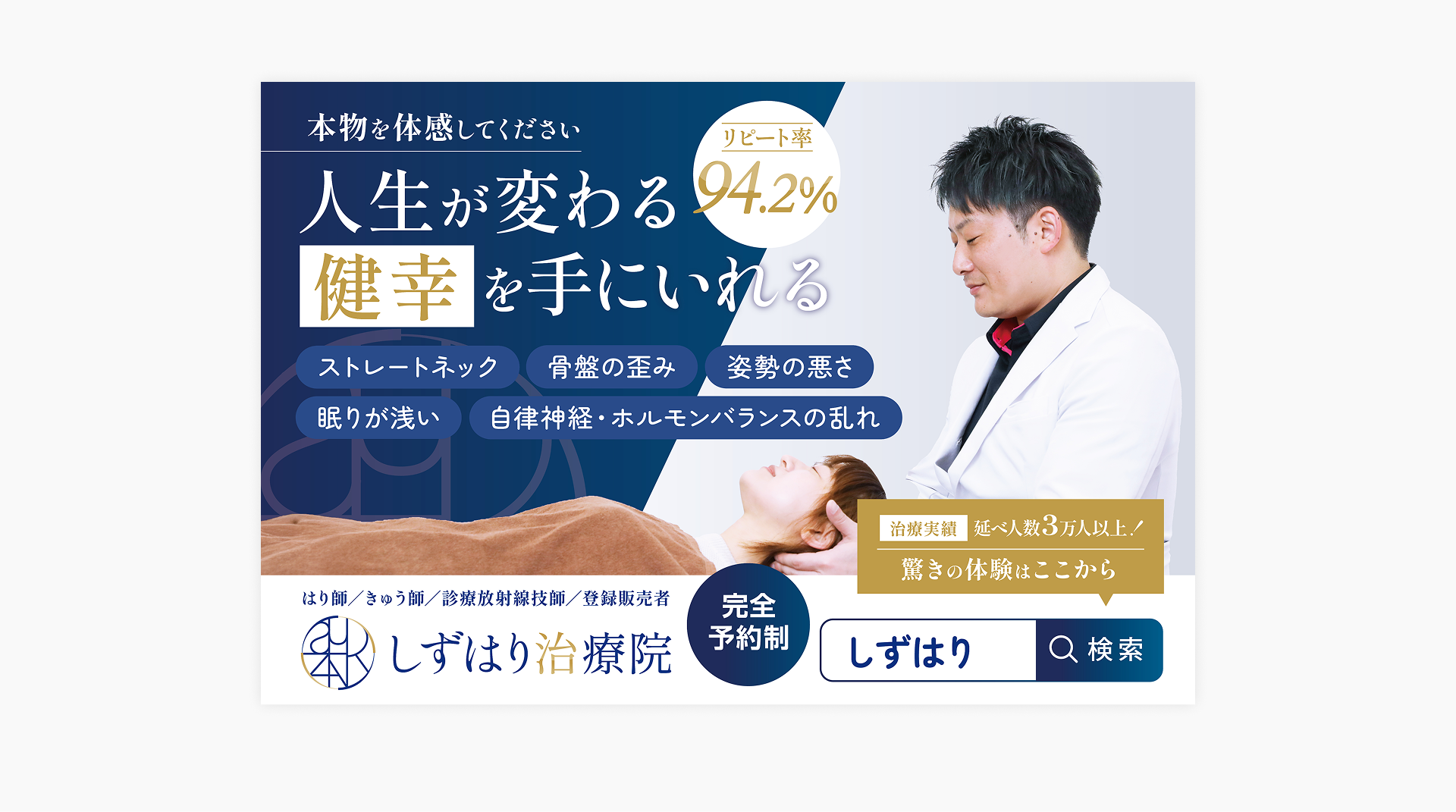 白衣×施術シーンの写真を大きく使い、「本物の施術を受けられる治療院」であることを直感的に表現。
