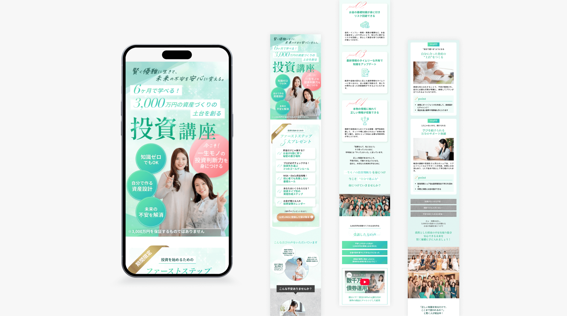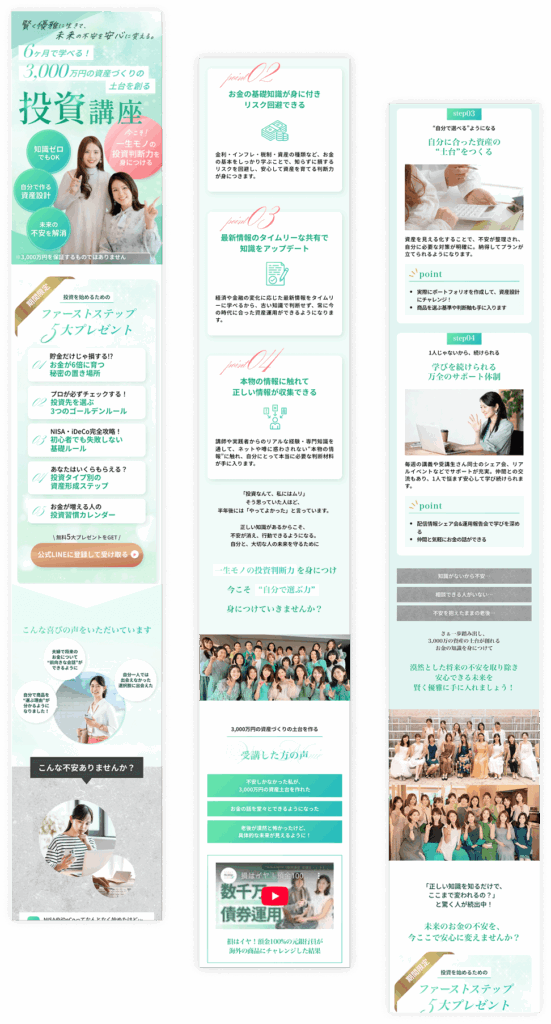 淡いグリーンを基調に、清潔感とやわらかさを感じられる配色と余白設計で、投資講座にありがちな「堅い」「怖い」印象を与えないよう調整しました。